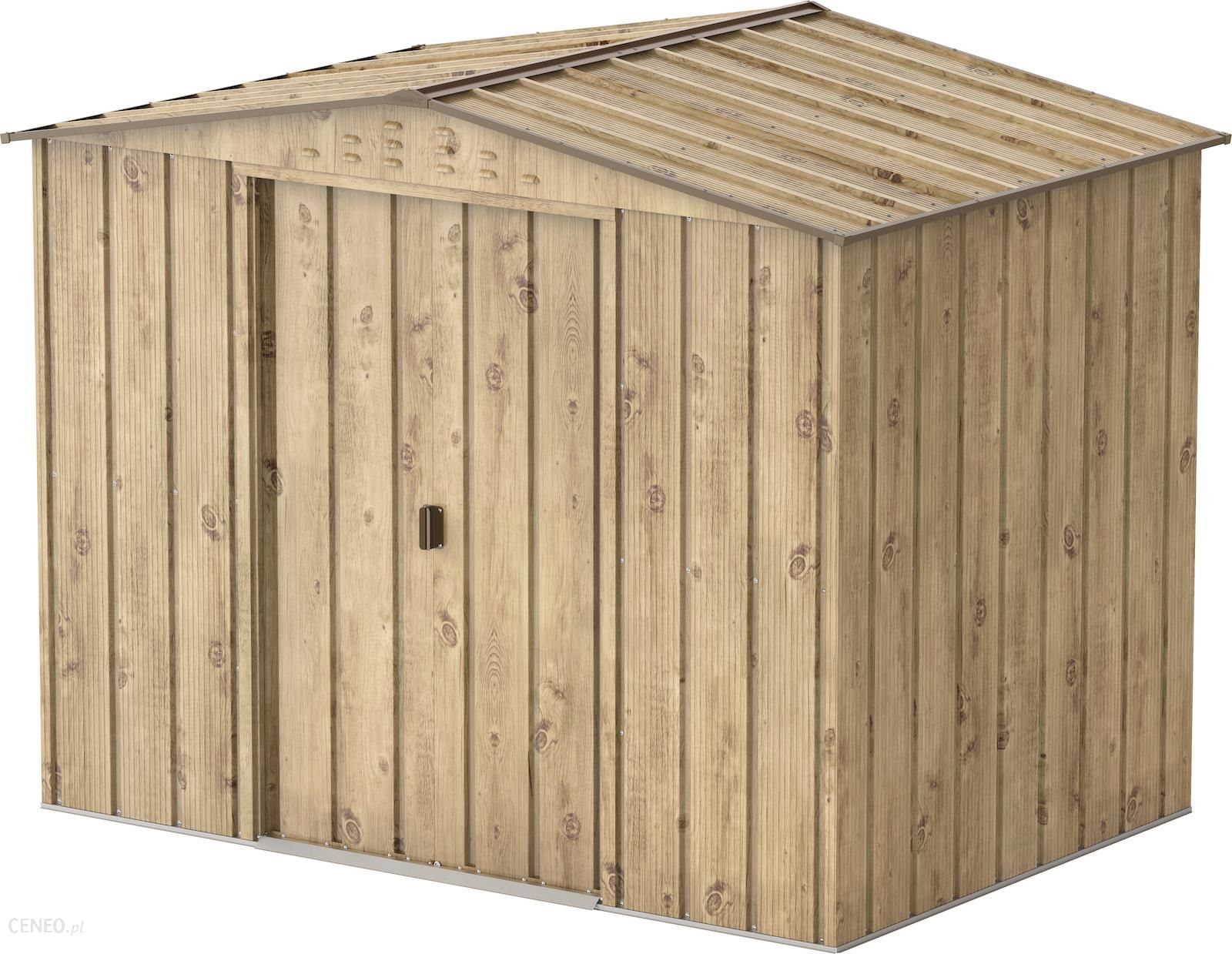 Duramax Metalowy domek ogrodowy Titan TOP 4,7 m² – imitacja dąb Odporna na warunki atmosferyczne, bardzo żywotna altana. Dwuskrzydłowe przesuwane drzwi zapewniają wygodny dostęp do wnętrza. Idealne i ekonomiczne miejsce do przechowywania narzędzi i mebli ogrodowych, motocykli, kosiarek, kos, rowerów i wielu innych. Dedykowana do ogrodu; do postawienia na równej, twardej powierzchni (beton, płytki, ramy drewniane, itp.). Prosty montaż. Czas trwania montażu około 3 godzin (min. 2 osoby). Dołączona szczegółowa instrukcja montażu wzbogacona ilustracjami. Wykonana z niezwykle wytrzymałej malowanej proszkowo ocynkowanej blachy. Parametry altanki ogrodowej Titan Top 4,7 m² imitacja dąb: Grubość blachy: 0,33 mm Kolor: imitacja dąb Podstawa – Szerokość: 251 cm; Głębokość 172 cm Powierzchnia zabudowy: 4,7 m2 Szerokość: 261 cm; Głębokość: 182 cm; Wysokość: 202 cm Powierzchnia wnętrza netto: 4,1 m2 Szerokość: 245 cm; Głębokość: 161 cm; Wysokość: 202 cm Szerokość otwarcia drzwi: 105×160 cm Waga: 70 kg Przesyłka dostarczana jest w kartonowym pudełku o wymiarach 78x165x10 cm Gwarancja na korozję: 20 lat Zestaw nie zawiera podłogi